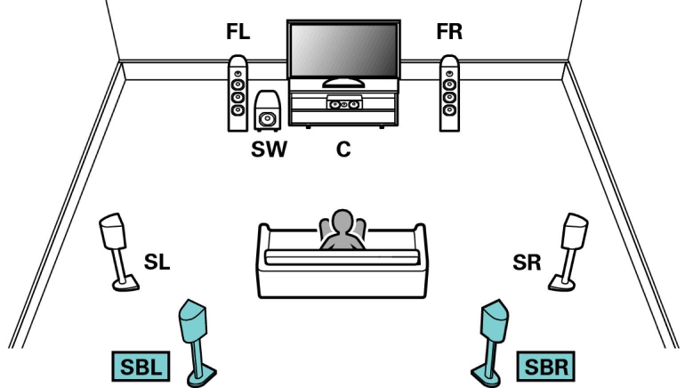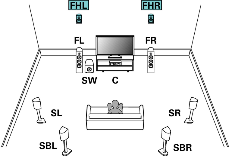 De 9.1-kanaals opstelling kan op twee verschillende manieren. Je houdt de hierboven genoemde opstelling voor 7.1-kanalen aan maar je kunt vervolgens kiezen voor hoogtekanalen aan de voorzijde of twee kanalen midden voor. Kies je voor midden voor dan staan de twee kanalen op dezelfde lijn als de surroundluidsprekers links en rechts en wijzen ze in een hoek van 505 – 70 graden naar de luisterpositie.