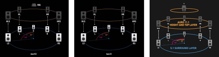 En dan is er nog het wat onbekendere Auro 3D. Dit surroundformaat gebruikt als basis de 5.1-kanaals opstelling zoals hierboven omschreven maar ziet dit als onderste laag. Boven deze laag wordt eenzelfde 5-kanaals laag geplaatst, net boven de onderste laag luidsprekers. Daarbij wordt exact boven de luisterpositie een kanaal geplaatst, ook wel de ‘voice of god’ genoemd. Eigenlijk is dit de optimale opstelling voor Auro 3D maar er zijn alternatieven zoals op de website van Auro omschreven.