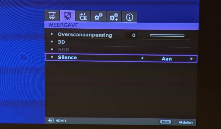 De projector beschikt ook over een ‘Silence’ mode die je apart moet activeren. Het beeld is dan beperkt tot Full HD resolutie, al kan je wel 4K content aanleveren, die wordt dan in Full HD gespeeld. Het geluid van de DLP-chip is dan aanzienlijk minder, omdat die niet meer moet shiften. Bij 4K HDR content wordt de pixelshifting automatisch terug geactiveerd. Deze beeldmode kan je overwegen voor Full HD beeldmateriaal als je minimaal achtergrondlawaai wenst.
