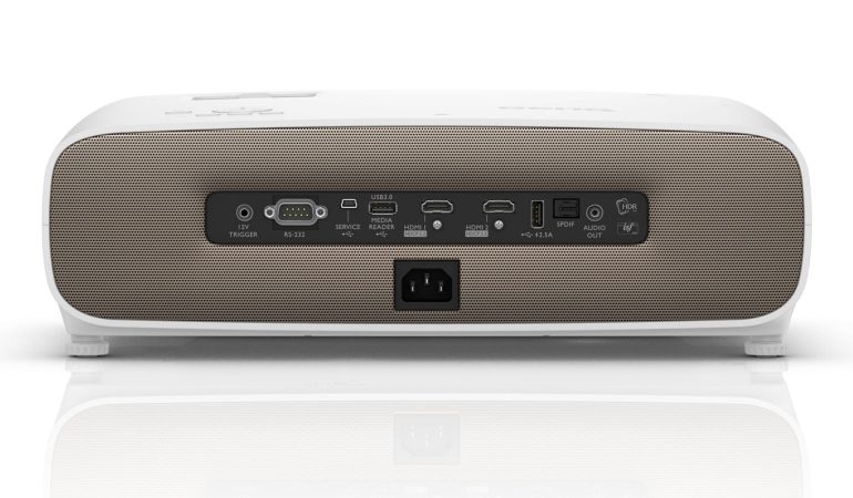 Een USB-aansluiting doet dienst als stroomtoevoer van bijvoorbeeld een Chromecast, maar een tweede aansluiting is wel degelijke bedoeld om media aan te leveren. Wie audio wil aansluiten op een externe oplossing heeft daarvoor een optisch digitale audio-uitgang en stereo minijack uitgang. Tot slot is er een 12V trigger voor automatisatie van een elektrisch scherm, en een rs-232 aansluiting voor wie de projector in zijn smart home omgeving wil inzetten.
