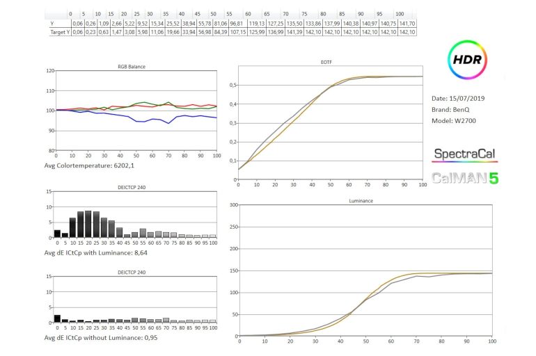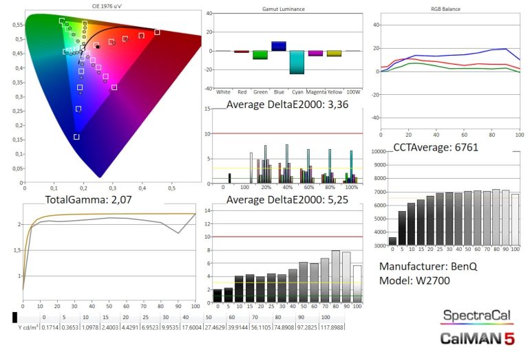 Alhoewel elke BenQ W2700 geleverd wordt met een kalibratiecertificaat, bleek de Cinema beeldmodus toch niet zo accuraat als gehoopt. De kleurtemperatuur is iets koel (lichte blauwe overtoon), en de gamma is iets te laag (2,07 ipv 2,2) waardoor de middentonen wat helderder zijn. De kleurweergave is daarentegen uitstekend, en als je bedenkt dat de W2700 zijn meeste werk vermoedelijk in een huiskamer met een beetje licht zal doen, dan zijn die koelere kleurtemperatuur en lagere gamma helemaal geen probleem. De beelden ogen erg kleurrijk, en er is voldoende zwartdetail zichtbaar (op voorwaarde dat je verduistert natuurlijk).