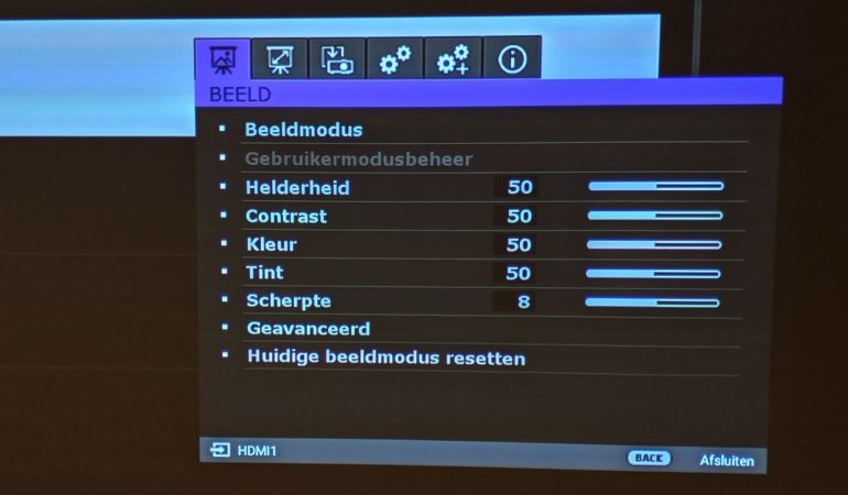 Het contrast is licht verbeterd, het eigen contrast van de projector ligt nu rond de 700:1. Dat is weliswaar nog steeds duidelijk geen puur thuisbioscoop terrein. Met behulp van de dynamische iris krijgen het contrast naar 1000:1 tot 2.000:1 afhankelijk van de instelling. Met de iris in ‘laag’ heb je de kleinste verbetering. Helaas zie je in de ‘hoog’ stand het beeld af en toe wat helderder of donkerder worden. Je hoort de iris ook zachtjes aan het werk. Als alternatief kan je de lamp in ‘SmartEco’ zetten. De iris kan je dan niet meer inschakelen, maar de lamp vervult essentieel dezelfde functie. Daarmee klom het contrast naar 3.000:1. De lamp reageert wel iets trager dan de iris.