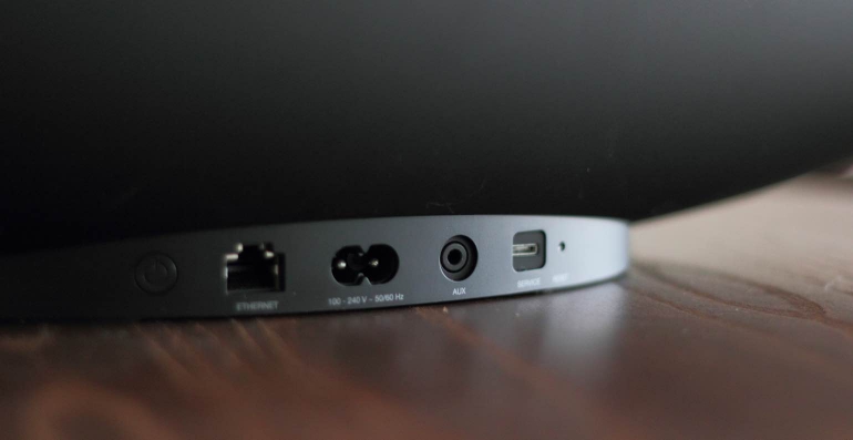 Qua aansluitingen is de Bowers & Wilkins Zeppelin Wireless voorzien van eigenlijk alleen een 3,5mm-aansluiting en een ethernetpoort. Beiden zul je waarschijnlijk niet gebruiken en Bowers & Wilkins zet hiermee duidelijk in op draadloze streaming middels Bluetooth, AirPlay en Spotify Connect. De usb-poort en de composiet video-output zijn deze keer achterwege gelaten.