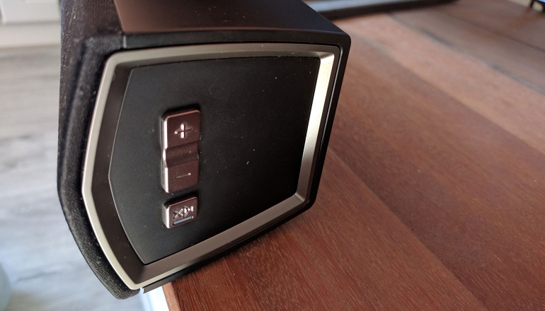 Aan de rechterkant van de soundbar zitten drie knoppen waarmee je het geluid kunt beheren. Een knop voor harde en zachtere volume, evenals een muteknop. Verder dien je de soundbar te bedienen met de afstandsbediening van de televisie (of de app) en in te stellen met de gratis te downloaden applicatie voor Android en iOS.