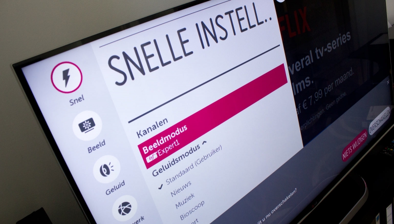 Bovenin het scherm zie je een klein tandwiel-icon waarmee je toegang krijgt tot de instellingen die aan de linkerzijde van het scherm verschijnen. De vormgeving van dit menu is wat eenvoudiger maar nog steeds erg duidelijk en eenvoudig te bedienen. Je kunt één van de vele presets voor het beeld gebruiken maar LG levert ook een handige Picture Wizard mee waarmee je door een paar stappen te doorlopen je tv zelf (deels) kunt kalibreren. Onder meer qua helderheid en contrast kun je hier je eigen aanpassingen maken, aan de hand van een afbeelding en advies van LG. Deze set-up is zeer eenvoudig en iets wat we graag van meer fabrikanten zouden zien.