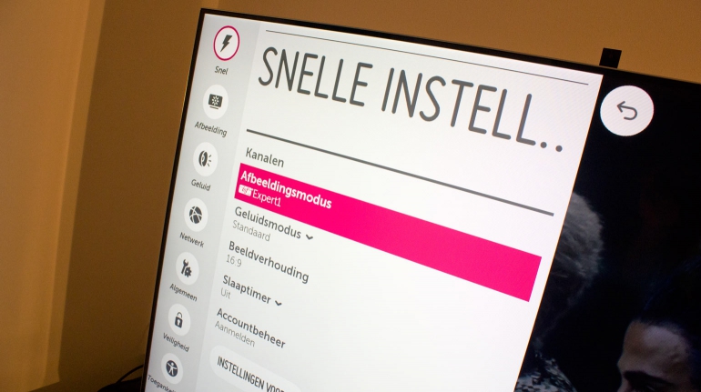 Bovenin het scherm zie je een klein tandwiel-icon waarmee je toegang krijgt tot de instellingen die aan de linkerzijde van het scherm verschijnen. De vormgeving van dit menu is wat eenvoudiger maar nog steeds erg duidelijk en eenvoudig te bedienen. Je kunt één van de vele presets voor het beeld gebruiken maar LG levert ook een handige Picture Wizard mee waarmee je door een paar stappen te doorlopen je tv zelf (deels) kunt kalibreren. Onder meer qua helderheid en contrast kun je hier je eigen aanpassingen maken, aan de hand van een afbeelding en advies van LG. Deze set-up is zeer eenvoudig en iets wat we graag van meer fabrikanten zouden zien.