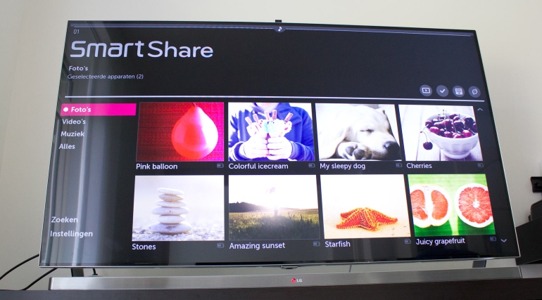 De DLNA-functie, in de vorm van SmartShare, werkt naar behoren. Het is eenvoudig om andere apparaten in je thuisnetwerk te vinden en vervolgens in een gebruiksvriendelijke interface naar bestanden en media te zoeken. Het werkt ook vrij vlot, al duurt het laden van een grote map op een NAS of pc nogal lang. Je kunt de weergave aanpassen naar lijstvorm of thumbnail-weergave. Wanneer je liever een fysieke usb-stick aansluit is dat ook mogelijk en de tv biedt ondersteuning voor een groot aantal digitale bestandsformaten, waaronder DiVX HD.