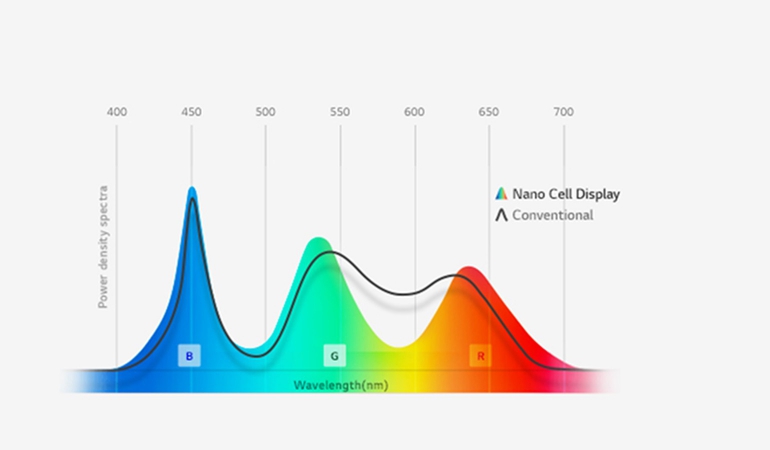 De LG 55SJ850V gebruikt een IPS-paneel met NanoCell technologie. Daarmee duidt LG op een extra filterlaag op het scherm opgebouwd uit nanodeeltjes die een deel van de ongewenste frequenties wegfilteren. Dat resulteert volgens de fabrikant in beter gedefinieerde, pure basiskleuren, en dus een groter kleurbereik.