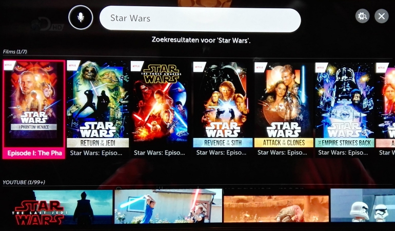 De Magic Remote is al jaren een vast onderdeel bij WebOS. Niet alleen functioneert hij als een traditionele zapper, maar door hem naar het scherm te richten bestuur je er ook een cursor in beeld mee. Dat maakt het erg handig om dingen te selecteren in de interface. Maar dat betekent niet dat je altijd aangewezen bent op het gebruik van de cursor. De remote zelf is erg volledig, met numerieke toetsen, d-pad, volume- en kanaaltoetsen, en twee specifieke toetsen voor Netflix en Amazon Video. Met de ingebouwde microfoon spreek je zoekopdrachten in. De resultaten komen uit YouTube en Netflix of je kunt verder zoeken op het internet.