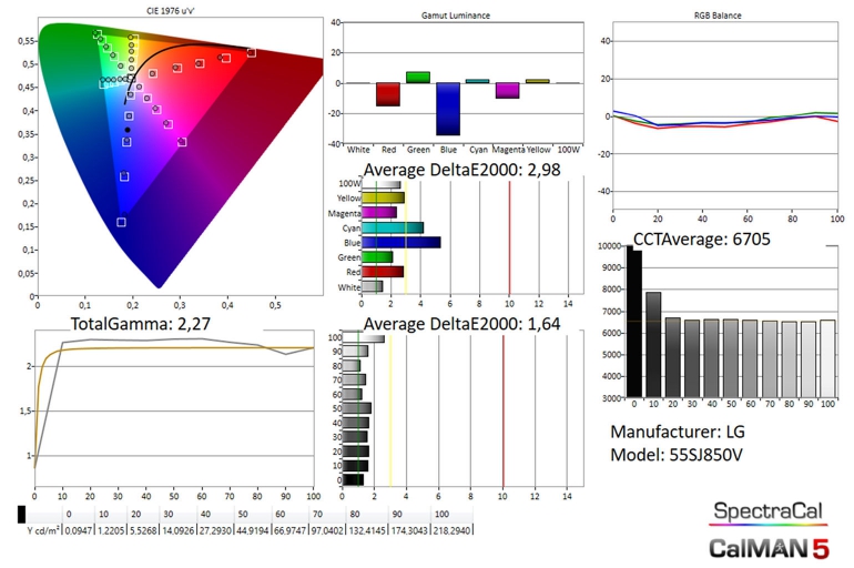 In SDR is de kalibratie van de SJ850V-serie lcd led tv’s bijzonder goed. Alle zwartdetail is zichtbaar, en de grijsschaal is mooi neutraal. Het kleurbereik is uitstekend en kleurweergave is over het volledige palet erg goed. De maximale helderheid ligt op 218 nits, en dat hadden we voor kijken overdag liever iets hoger gezien (rond de 250). Het is af te raden om de tv te gebruiken bij verduistering, de matige zwartwaarde kan dan erg zichtbaar zijn. Laat altijd een beetje achtergrondverlichting aan, en dat probleem verdwijnt grotendeels.