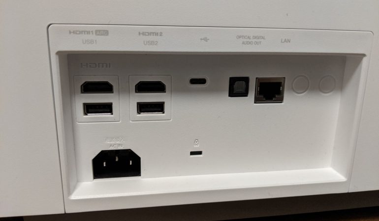 De projector is uitgerust met twee HDMI-aansluitingen, beide klaar voor Ultra HD HDR, en een is uitgerust met ARC. Daarnaast zijn er twee USB-poorten en en USB-C poort. Die laatste kan gebruikt worden om een laptop of smartphone aan te sluiten indien die toestellen de ‘DisplayPort (DP) Alternative Mode’ ondersteunen. Tot slot is er nog een optische digitale audio-uitgang en een netwerkaansluiting. De projector is ook voorzien van WiFi en Bluetooth voor een draadloze hoofdtelefoon of om de projector te gebruiken als Bluetooth speaker.