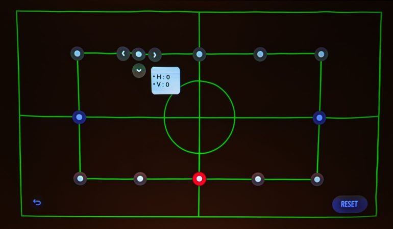 Hou er ook rekening mee dat zelfs een kleine verplaatsing van de projector al grote gevolgen kan hebben voor het beeld. Wanneer de projector zelfs een fractie schuin staat krijg je duidelijke trapeziumvervorming. De eerste opstelling vereist daarom wat extra geduld. LG biedt een zeer uitgebreide keystone correctie (op basis van 12 punten die je individueel kunt aanpassen, zie foto hierboven), maar probeer dat te vermijden, keystone correctie resulteert immers altijd in detailverlies. Met de manuele focusring midden op het toestel stel je het beeld scherp.