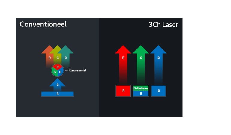 De LG is uitgerust met een dubbele laser: een rode en een blauwe. Die laatste wordt gesplitst om via een fosfor ook groen te creëren. Dat betekent dat er geen kleurwiel in de projector zit, wat voor een deel verklaart waarom hij relatief stil is, maar de projector heeft dus ook geen last van regenboogeffect.