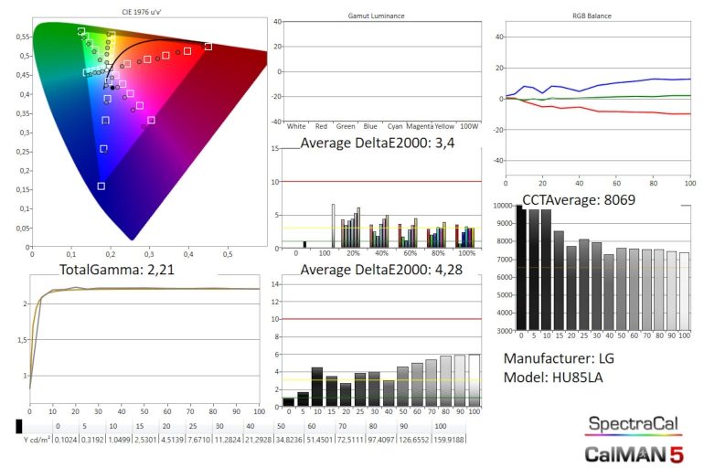 De beeldinstellingen zijn net als op de LG tv’s erg volledig. Er is een volledig kleurbeheersysteem aan boord, en 2-punts en 20-punts grijsschaal aanpassing. De menu’s opstarten duurt enkele seconden, maar zodra ze op het scherm staan zijn er geen verdere vertragingen.
