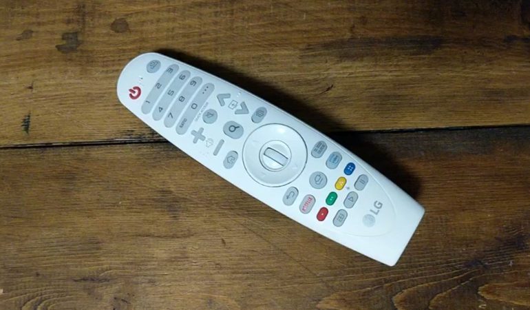 De afstandsbediening ziet er erg bekend uit voor wie een LG televisie in huis heeft. Afgezien van enkele kleine wijzigingen is dit een standaard Magic Remote. De aanwijzer op het scherm bedien je eenvoudig door de remote te bewegen. Dat principe is erg handig binnen WebOS, maar vereist soms wat gewenning. Wie dat wilt kan de hele interface ook bedienen zonder de aanwijzer te gebruiken.