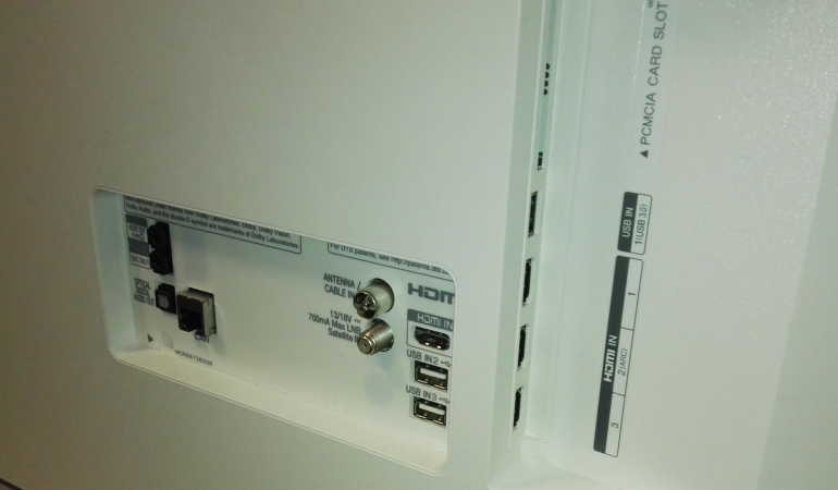 Alle HDMI-aansluitingen zijn met HDMI 2.0b en HDCP 2.2 uitgerust, zodat je op allemaal Ultra HD-bronnen kunt aansluiten. Een van de aansluitingen staat achteraan. Verder vinden we achteraan twee maal USB, een digitale optische audio-uitgang, een hoofdtelefoonaansluiting en de bedrade netwerkaansluiting. De aansluitingen achteraan staan naar de wand gericht, een aandachtspunt als je voor wandmontage kiest.