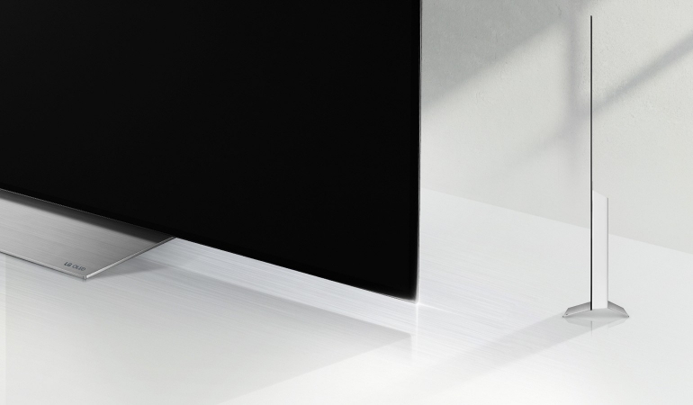 Wie lager in het OLED-aanbod shopt, levert licht in op design. Maar je mag er van op aan, iedereen zal het toestel nog steeds onmiddellijk als een OLED-tv herkennen. LG liet de bovenste helft zo dun mogelijk, een kleine 5 mm, terwijl de onderzijde van het toestel wat dikker (47 mm) is. Daar huizen natuurlijk alle elektronica, luidsprekers en aansluitingen.