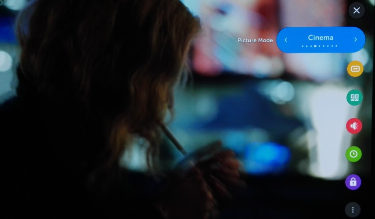 Een druk op de knop levert je een aantal snelle keuzes aan de rechterzijde van het scherm (beeldmode, geluidsmode, …). Een optie leidt je naar het volledige menu waar je aan alle instellingen kan sleutelen.
