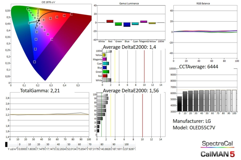 De LG OLED55C7V komt met dezelfde prachtige kalibratie als de E7. Je krijgt werkelijk beeld van referentie-kwaliteit. Er is erg veel zwartdetail zichtbaar, een aspect waar LG flink aan gesleuteld heeft. De grijsschaal is perfect neutraal en volgt een 2,2 gammacurve, ideaal voor de meeste kijkomstandigheden. Kleurbereik en kleurweergave zijn prachtig.