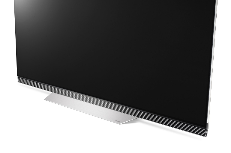 LG blijft dit jaar bij zijn ‘Picture on glass’ design. Het oled –paneel zit gemonteerd op een glasplaat die net iets groter is dan het paneel en zo een transparant randje rond het scherm creëert. Onderaan het beeld zit de soundbar, die met zijn horizontale grille het beeld onderlijnt. De voet is een centrale, aluminium bodemplaat die lichtjes naar boven helt, maar toch wat saai oogt.