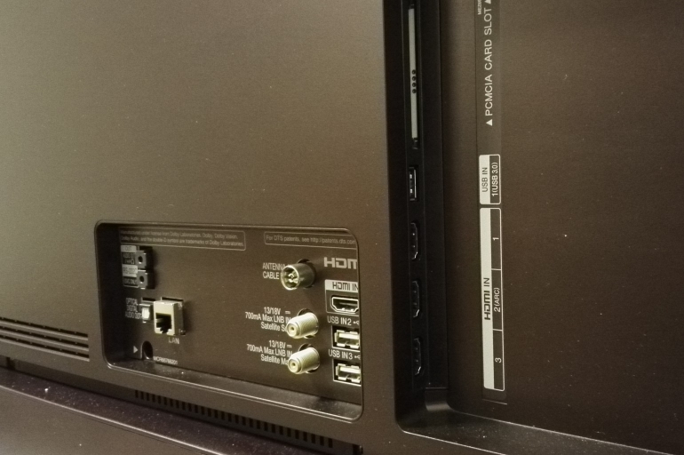 Aan de zijkant beschik je over drie HDMI-aansluitingen, en een USB-aansluiting. Achteraan vind je een maal HDMI, twee maal USB, een digitale optische audio-uitgang, een hoofdtelefoonaansluiting, RS-232 voor besturing, en de bedrade netwerkaansluiting. Alle aansluitingen achteraan staan naar de achterwand gericht, dus vereisen wat extra aandacht bij wandmontage. De hoofdtelefoonaansluiting is vrij lastig te bereiken, maar de E7 is uitgerust met Bluetooth, dus je kunt ook voor een draadloze hoofdtelefoon kiezen.