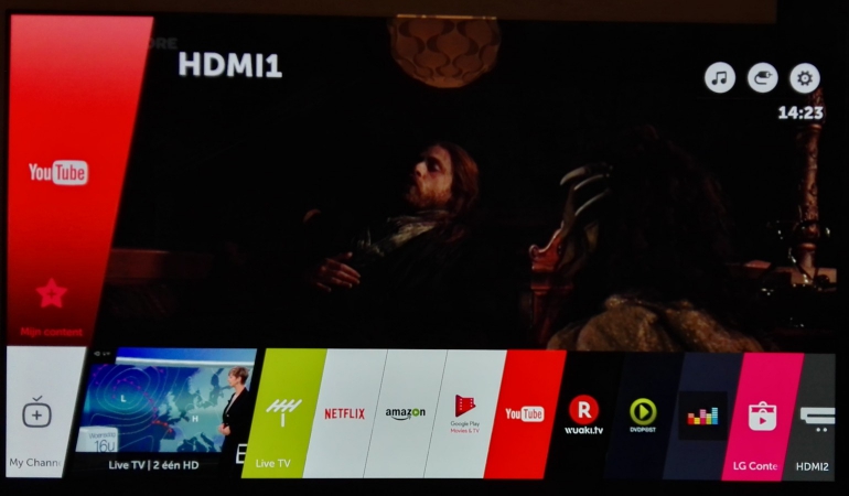 WebOS, het smart tv-systeem van LG is ondertussen aan versie 3.5 toe. De speelse maar erg handige interface blijft een van onze favorieten. In dagelijks gebruik vind je alles op het Home –scherm terug, dat de vorm neemt van een lint onderaan het scherm met iconen voor alle bronnen op het toestel, van live tv, tot externe ingangen en internet toepassingen.