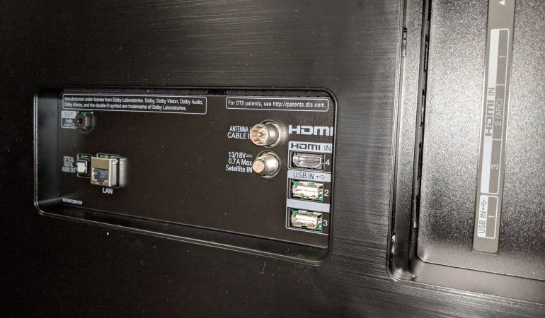Het toestel is uitgerust met vier HDMI-aansluitingen, waarvan drie aan de zijkant en een aan de achterkant. Ze zijn allemaal klaar voor Ultra HD HDR. Aan de zijkant vinden we verder een USB-aansluitingen, en achteraan twee extra USB-aansluitingen, de hoofdtelefoonuitgang, optisch digitale uitgang, netwerkaansluiting en antenne-aansluitingen. Alle aansluitingen achteraan wijzen naar de achterwand, dus dat is een aandachtspunt als je voor wandmontage kiest.
