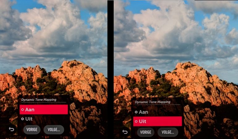 Voor HDR10 en HLG voorziet LG een eigen vorm van dynamische tonemapping, waarmee het het gebruik van dynamische metadata nabootst. Je kan dit activeren met behulp van ‘Dynamic Tone Mapping’. Het resultaat is dat bepaalde delen van het beeld iets helderder worden, maar vooral in de highlights merk je dat er met dynamische tonemapping veel meer lichtdetail zichtbaar is. In de onderstaande foto is dat duidelijk merkbaar in de centrale wolkenkop.
