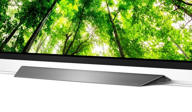 Design is in het premium segment een belangrijk gegeven. Een 65 inch toestel is indrukwekkend groot, en we willen graag dat het als design-object in de woonkamer staat, en niet als een lompe kolos. LG gebruikt op de E8-reeks nog steeds het Picture-on-glass design, maar alhoewel er veel gelijkenissen zijn met model van vorig jaar, zijn er ook opvallende verschillen. Het scherm is bevestigd op een glasplaat, maar die steekt slechts een millimeter voorbij het scherm. Ook de voet herinnert aan vorig jaar, een centrale aluminium voetplaat die licht naar voor helt.