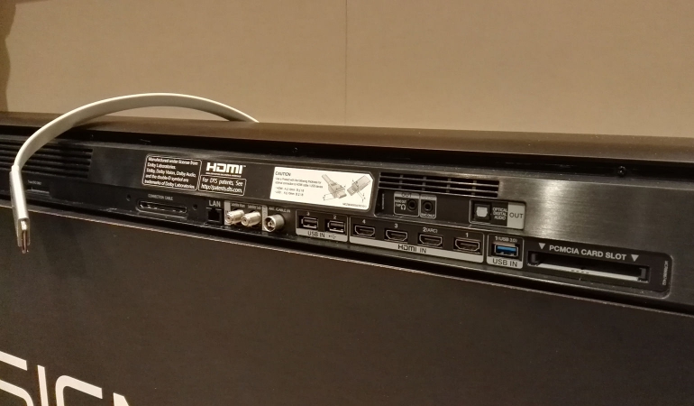 Zoals hierboven vermeld zitten alle aansluitingen op de soundbar. Je vindt er vier HDMI-aansluitingen, waarvan een met ARC, en alle vier HDMI 2.0b. Verder zijn 3 USB-aansluitingen (1x 3.0), een optisch digitale uitgang, een hoofdtelefoon aansluiting, en drie antenne -aansluitingen. Allemaal wijzen ze naar de muur, wat maakt dat de achterzijde van de soundbar vijf tot tien cm van de muur moet staan, om plaats te laten voor de connectoren en de kabels.