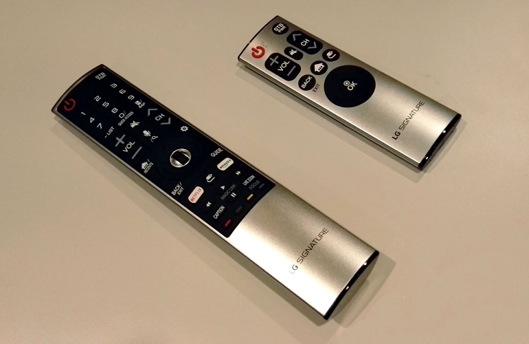 De LG OLED65W7V wordt geleverd met twee afstandsbedieningen. De grote Premium Magic remote is quasi identiek aan die van vorig jaar. Enkel de Netflix en Amazon toetsen zijn nieuw. Vermits onze testmodellen VS-versies waren, zijn we niet zeker of deze toetsen ook op de EU-versie aanwezig zullen zijn. De layout is goed, en de toetsen werken aangenaam. Ondanks zijn klassieke vorm kan je de remote nog steeds gebruiken om dingen aan te wijzen op het scherm. De ingebouwde microfoon gebruik je voor zoekopdrachten en eenvoudige commando’s zoals ‘Volume up’ of ‘Netflix’.