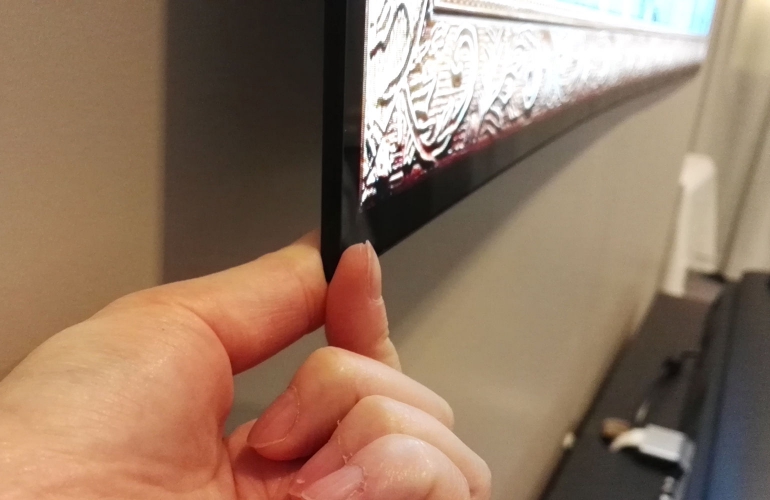 Zodra je een televisie reduceert tot enkel nog een drie mm dun scherm valt er natuurlijk nog weinig te vertellen over het design zou je denken. Integendeel, we zien nu voor het eerst wat de voor- en nadelen zijn van zo een ontwerp. De LG OLED65W7V ziet er uiteraard fantastisch uit aan de muur. De wandbeugel is niet meer dan een grote vlakke plaat, met twee kleine knopjes in de bovenhoeken. Je laat de tv van boven naar beneden over die knopjes glijden, zodat ze in twee uitsparingen op het scherm grijpen. Magneten doen de rest van het werk en houden het scherm mooi op zijn plaats. Rond het beeld zit nog een zwarte rand van een kleine cm, maar dat is het. Puur alleen beeld aan de muur!