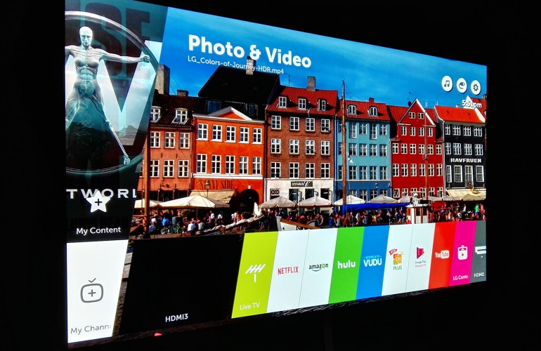 WebOS blijft een van onze favoriete Smart TV systemen. Het Home scherm bevat een lint onderaan het scherm waarop je alle content mogelijkheden vindt: live tv, internet toepassingen, ingangen en ingebouwde functies zoals de mediaspeler. De volgorde van de iconen bepaal je zelf. Links bovenaan vind je de iconen voor de muziekspeler, de ingangen en alle instellingen.