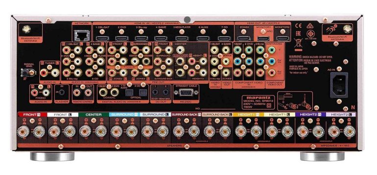 Met zijn elf luidsprekeruitgangen kun je met de SR8012 verschillende richtingen uit: een 7.2.4-opstelling bouwen voor een uitgebreide Dolby Atmos-, Auro 3D– of DTS:X-ervaring of opteren voor een meer bescheiden surroundinstallatie in combinatie met een tweede of derde zone. Zoals je zou verwachten bij een Marantz aan dit prijspunt beschik je over aardig wat opties, waaronder keuzes die muziekliefhebbers en veeleisende surroundminnaars gelukkig moeten maken. Zo kun je bijvoorbeeld een 5.1-opstelling bouwen die op alle kanalen gebi-amped is of een 9.1 met bi-amping voor de stereokanalen. Of nog interessanter voor audiofielen: stel een 5.1 samen op basis van een surroundpakket en voorzien een tweede paar front-vloerstaanders die enkel worden gebruikt voor muziekweergave. Het is ook mogelijk om een vijfde hoogtespeaker in te stellen (een ‘voice of god’ voor Auro 3D-opnames) door de SUB2-uitgang te gebruiken.