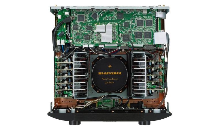 De SR8012 is heel wat gespierder, een pluspunt als je ongevoeligere luidsprekers (en dat kunnen ook compactere boekenplankspeakers of centers) rondom moet aansturen. Als we onder de motorkap kijken, zie je ook een indrukwekkender opbouw dan bij een instapreceiver. Ons oog wordt meteen getrokken door een grote ringkerntransformator omringd door twee grote koelvinnen. De SR8012 bezit een voeding die zeer stabiel zou moeten zijn, belangrijk als je soundtracks weergeeft met grote dynamische sprongen – en dat zijn nagenoeg alle actiefilms. Opvallend is bovendien dat de elf kanalen qua versterking identiek opgebouwd zijn, wat wederom belangrijk is bij een volwaardige thuisbioscoop waar je rondom liefst identieke luidsprekers plaatst. Dat de Marantz SR8012 echt de kaart van muziek trekt, dat zal je nog vaker lezen in deze review. Op technisch vlak zijn er daarvoor een bepaalde keuzes gemaakt. Dat er in de SR8012 HDAM-modules voorkomen, bijvoorbeeld, al zal dat niet verbazen aangezien Marantz grote fan is van dit print-gebaseerd alternatief voor opamp-IC’s. Marantz maakt ook veel van de DAC’s die aanwezig zijn in de SR8012, al missen we op dat vlak wel wat informatie. Je vraagt je misschien ook af op welk vlak de SR8012 verschilt van het Denon-vlaggenschip AVR-X8500? Dat zal je vooral ontdekken in het toekomsige recensie van dat beest van een receiver, maar we voorspellen alvast dat een zeker verschil klankmatig is. Sound United heeft al meermaals aangegeven dat Denon en Marantz nog meer op een eigen klankidentiteit moeten inzetten.