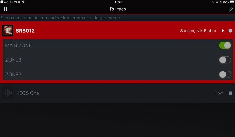 Sinds dit modeljaar is HEOS een functie op Marantz-receivers en bijna alle AV-receivers van Denon. Best interessant, want het brengt twee grote voordelen naar de SR8012. Om te beginnen is er het aspect ‘multiroom’, wat betekent dat je muziek kunt afspelen op de receiver en op draadloze HEOS-speakers. Handig als je bijvoorbeeld een playlist in de woonkamer en pakweg in de keuken wil horen. HEOS is op dat vlak heel volwassen, en laat toe dat je in verschillende zones andere liedjes speelt en zones ad hoc koppelt. Dat gaat heel vlot via de HEOS-app. In de HEOS-app verschijnt de SR8012 als één toestel met drie zones die je afzonderlijk kunt in- en uitschakelen. Het is niet mogelijk om in elk van die SR8012-zones iets anders te beluisteren, dat hopen we ooit wel te zien.