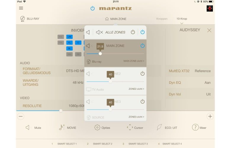 Eigenlijk grepen wij vooral naar de bijhorende Marantz 2016 AVR-app. Die zou op enkele puntjes kunnen verbeterd worden, bijvoorbeeld door de diepere receiverinstellingen volledig in-app toegankelijk te maken. Maar globaal genomen zit het goed in elkaar en is het responsief. Vooral op een tablet dan. Zaken als de geluidsmodus veranderen en aangesloten toestellen (zoals een Blu-rayspeler) bedienen vonden we gewoon veel handiger via de app dan via de remote. Je zal in de Marantz-app trouwens een icoontje zien die verwijst naar HEOS. Tik hierop en je wordt naar de HEOS-app gebracht. Visueel ziet die app er helemaal anders uit, maar op zich is dat geen ramp. We vertellen je meteen er meer op, onder het kopje ‘HEOS aan boord’.
