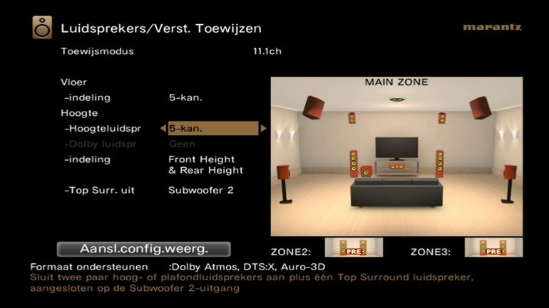Het lijkt wel alsof er aan elk scenario is gedacht, vooral als je weet dat je per mogelijke opstelling aardig wat kunt aanpassen. Je moet gewoon even de logica doorgronden. Wil je bijvoorbeeld snel een simpele 5.1-opstelling, dan selecteer je 9.2 + ZONE2 en kies je bij Vloer voor ‘5-kan’ en ‘geen’ bij de hoogtespeakers.