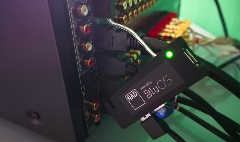 De set-up van de T 758 v3 verloopt behoorlijk anders dan bij een typische receiver. En dan heeft allemaal te maken met het ontbreken van een ingebouwde netwerkmodule. In tegenstelling tot hogere NAD’s heeft deze receiver inderdaad geen netwerkpoort of WiFi. Oei, zijn er dan geen streamingopties? Toch wel, en zelfs behoorlijk goede – van Bluesound. Maar zo kom je dus bij de meer aparte set-upprocedure. Het allereerste wat je moet doen na het uitpakken en opstellen is een compacte externe adapter insteken via een USB-poort aan de achterkant. De adapter zelf is niet al te groot, maar de USB-kabel die er aan vast hangt is wat kort, waardoor het geheel in de weg bengelt als je met de onderliggende HDMI-ingangen bezig bent. Gelukkig levert NAD een USB-verlengkabeltje mee zodat je de adapter iets handiger kunt plaatsen.