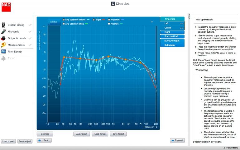 Na afloop van de metingen kijken we blij op. NAD heeft er voor gezorgd voor dat je met Dirac meerdere filters kunt creëren én uploaden naar de receiver. Zo kun je achteraf snel wisselen tussen tot drie filters om te bepalen welke je het beste vindt. Net dit was onze grote verzoek na de test van de Arcam AVR550. Bij de Britse receiver kun je maar één filter uploaden, wat betekent dat je nooit kunt A/B-testen tussen twee getweakte filters. Dat vonden we spijtig, want ervaring leert dat je meestal toch een paar pogingen nodig hebt om net de juiste filter te vinden.