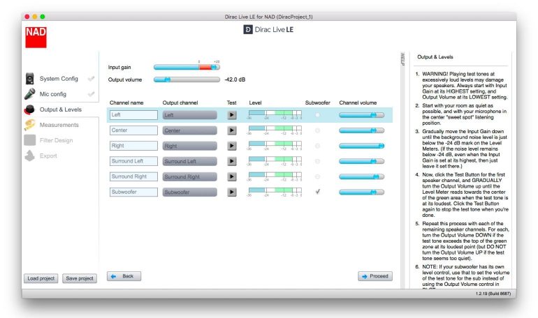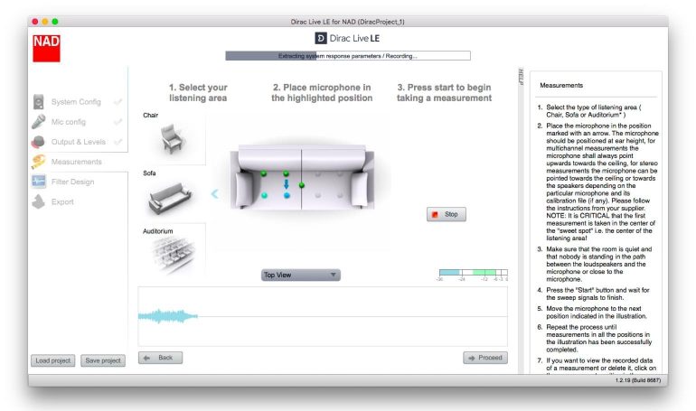 Dirac gebruiken vereist wel wat inzicht en geduld. Zo is het extreem belangrijk om nog voor de metingen via de Dirac-software de niveaus van de verschillende kanalen goed af te regelen. Even belangrijk is dat je de microfoon telkens op de negen meetposities correct plaatst én op oorhoogte. Ook niet vergeten dat je voor Dirac-metingen voor surround altijd de microfoon naar het plafond richt. Met de basale hockey-puck-vormige microfoon die NAD meelevert is dat geen probleem, omdat die altijd naar boven gericht is. Wij zouden niettemin aanraden om te investeren in een nauwkeurigere USB-meetmicrofoon. Dat hoeft geen enorm bedrag te kosten; wij gebruiken daarvoor de UMIK-1 van miniDSP die circa 80 euro kost. Het is een kleine investering die veel kan opbrengen.