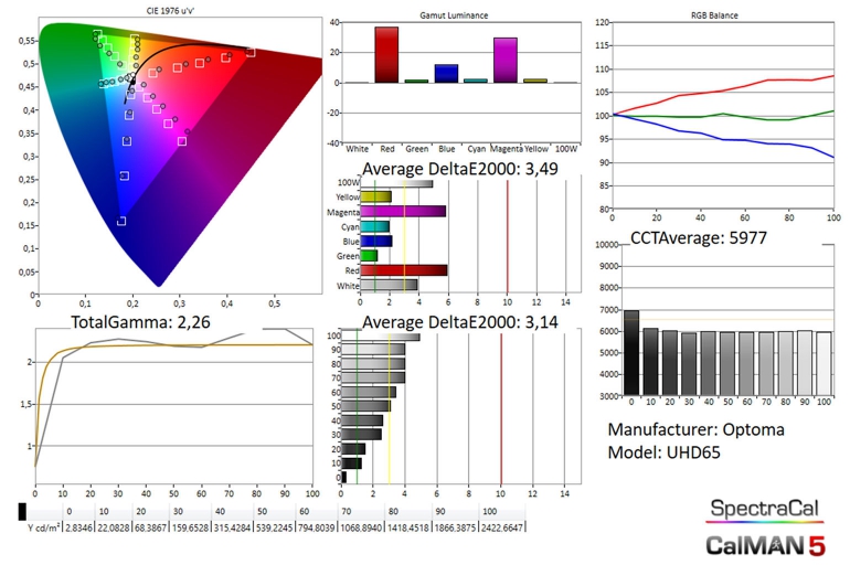 De Reference beeldmode is goed gekalibreerd. De grijsschaal toont een te warme kleurtemperatuur, zodat het beeld iets te veel naar rood neigt, maar geen hinderlijke tintverschuivingen. Het helderheidsverloop volgt netjes de gamma 2,2 waarde. Wie in verduistering kijkt kan overwegen om de gamma naar 2,4 te schakelen voor een iets intenser beeld. De projector verbergt een klein tikje witdetail, en dat konden we vreemd genoeg niet corrigeren met de contrast-instelling. Het verlies is echter klein, en daarom niet storend. Zwartdetail toont hij wel uitstekend. Het kleurbereik is goed, maar rood en magenta zijn duidelijk wat te helder. De projector laat in het saturatieverloop van de verschillende kleuren een steek vallen bij rood en groen, maar de fout is niet ernstig genoeg om het kijkplezier te vergallen.