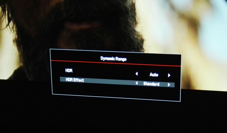Daar kies je HDR best ‘auto’, zodat de projector automatisch HDR-input herkent. Vermijd ‘SDR -> HDR’. Die stand maakt de beelden bijna cartoonesk intens, met sterk overdreven kleuren en contrast. Wens je een pseudo-HDR effect, kies dan de HDR beeldpreset. Met behulp van HDR-effect (licht, standaard, film en detail) pas je dan de weergave aan. Licht is de meest heldere, maar die verbergt enorm veel witdetail. Detail levert iets meer zwartdetail maar maakt het beeld aanzienlijk donkerder. Standaard en Film zitten tussen de twee in op vlak van helderheid en we verkiezen meestal Film.