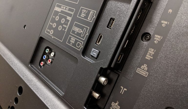 De analoge aansluitingen, één HDMI, één USB-aansluiting en de digitaal optische uitgang staan aan de achterzijde en wijzen naar de muur, wat lastig kan zijn bij wandmontage. De andere aansluitingen staan de zijkant (inclusief netwerk en de twee antenne-aansluitingen), en ze staan slechts 10 cm van de rand. Om te vermijden dat de kabels zichtbaar zijn naast de tv moet je ze dus wat netjes wegleiden. Beide voeten zijn daarom voorzien van slots voor kabelbeheer.