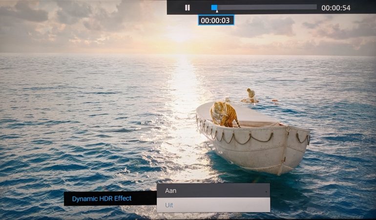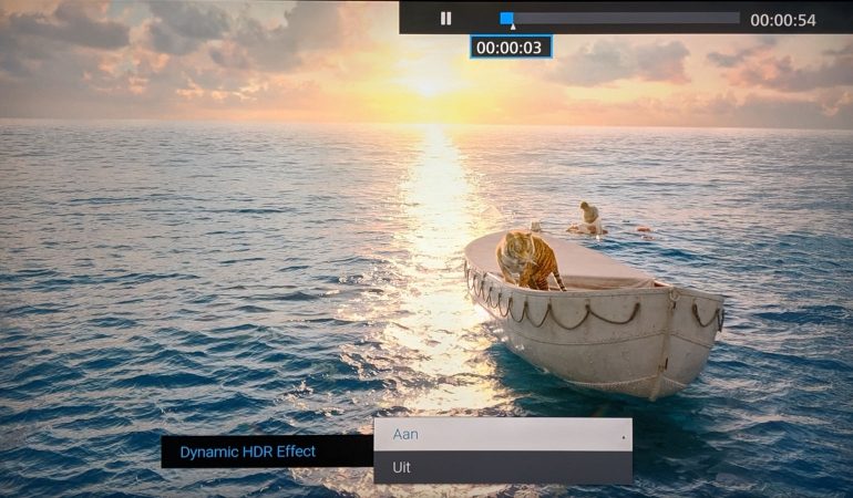 Merk op hoe in bovenstaand beeld de invloed van Dynamic HDR Effect vrij sterk is. Het beeld wint aan kleur en impact en komt dichter bij een referentie die we bekeken op een OLED-scherm.