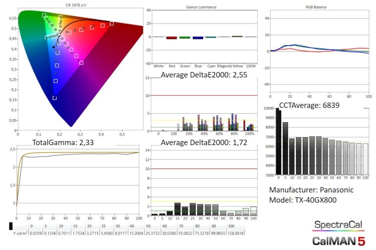 De True Cinema mode is goed gekalibreerd, maar zeker niet foutloos. De gammawaarde klokt af op ongeveer 2,3. Dat is iets helderder dan verwacht (2.4) maar geen probleem. De zwartwaarden zijn netjes zichtbaar. De kleurtemperatuur is licht te koel (lichte blauw-cyaan overtoon). Vooral in de kleurweergave zien we dat het scherm rood en blauw licht minder verzadigd toont. Rode, blauwe en magenta tinten zijn iets minder intens dan gewenst.