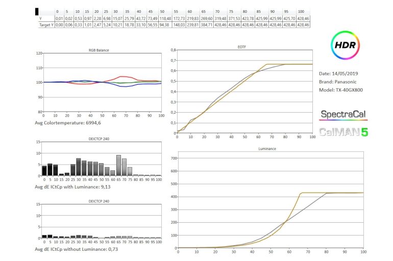 De TX-40GXW804 tv ondersteunt naast HDR10 en HLG, ook Dolby Vision en HDR10+. Daarmee is deze middenklasser uitstekend uitgerust voor HDR weergave. De kalibratie is degelijk, maar net zoals in SDR niet foutloos. De tv toont netjes alle witdetail, maar toont vaak ook meer dan nodig is op basis van de metadata. Als de metadata bijvoorbeeld 1.000 nits max aangeeft, is ook hoger witdetail tot 1.500 nits nog zichtbaar. Daardoor is het beeld iets minder helder dan het moet zijn. Je kan op de grafiek ook zien dat onder de 200 nits het beeld iets te helder is (geen echt probleem), maar daarboven vrij scherp aan helderheid verliest. We zien ook dat kleuren vrijwel allemaal niet verzadigd genoeg zijn, waardoor het beeld aan impact verliest.