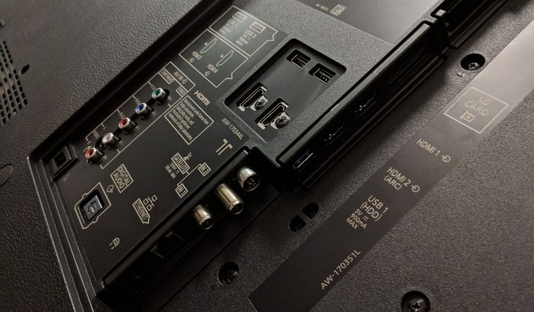 De aansluitingen achteraan staan naar de wand gericht, dat vereist extra aandacht bij wandmontage. Er is Bluetooth voor toetsenbord/muis en voor draadloze hoofdtelefoon. Gebruik voor je Ultra HD HDR bronnen best HDMI 1-2, enkel die leveren de vereiste volledige bandbreedte voor de beste kwaliteit. Een afneembaar paneel verbergt alle aansluitingen en er is kabelbeheer voorzien om de kabels netjes langs de achterzijde van de voet weg te leiden.