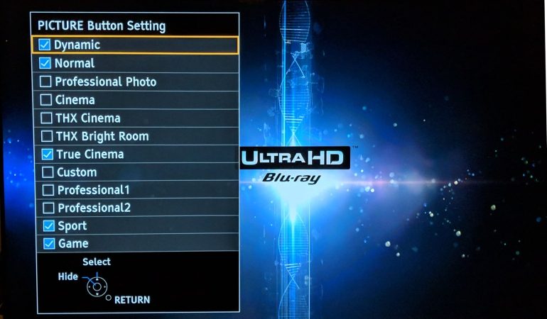 Persoonlijk vinden we deze remote zelfs iets handiger dan die luxe uitvoering. De rubber toetsen voelen wat comfortabeler aan, en zijn makkelijker te vinden op de tast waardoor een vergissing minder makkelijk voorkomt. Erg handig op deze remote is de Picture toets links bovenaan. Via de menu’s stel je in welke beeldmodes je kunt kiezen met deze toets. Zo hoef je niet door alle modes te gaan (Panasonic biedt er zo maar even 12).