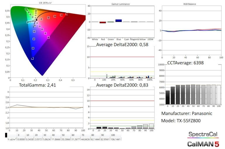 De grijsschaal is perfect neutraal en levert de juiste kleurtemperatuur, en is ingesteld op een gamma van 2,4, ideaal voor thuisbioscoop. Wie bij omgevingslicht kijkt kiest voor Professional 1, die een 2,2 gamma hanteert voor iets lichtere middentonen. Mooi zichtbaar op de gammacurce is de kleine bult rond 10% helderheid. Ook deze Panasonic drukt een klein beetje zwartdetail weg. Wie dat wenst te compenseren kan de Helderheid naar 1 of 2 trekken (zeker niet hoger), maar je riskeert dan ook hier en daar ongewenste ruis in donkere scènes zichtbaar te maken. Gezien de nauwkeurigheid van de kalibratie lijkt Panasonic er dus expliciet voor te kiezen om dat schaduwdetail iets donkerder te maken en zo eventuele problemen verborgen te houden.